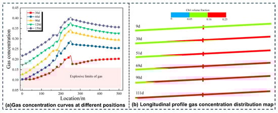 Methane concentration profile of model 3: (a) methane concentration curves; (b) methane concentration distribution map.