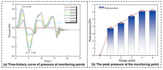 As shown in Figure 10a, when the tunnel was filled with premixed methane, the pressure variations at different monitoring points were relatively consistent. In the early stages of the explosion, the pressure inside the tunnel rose rapidly, reaching a peak value of 6.18 kPa at 2.4 s. Subsequently, the pressure dropped sharply and became negative, reaching its lowest value of −7.58 kPa at 5.2 s. As the explosion progressed, the pressure fluctuations became more pronounced, indicating that the flow field inside the tunnel had become highly turbulent. Finally, the pressure at all monitoring points tended toward zero, signifying the end of the explosion process.