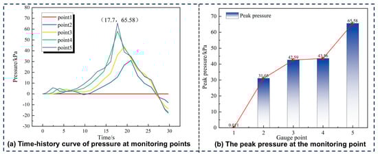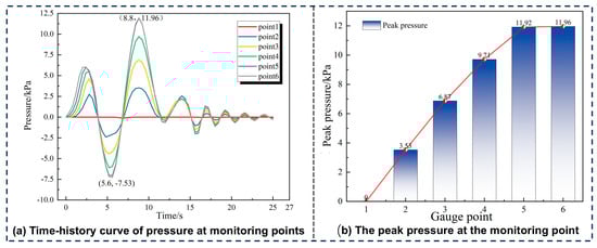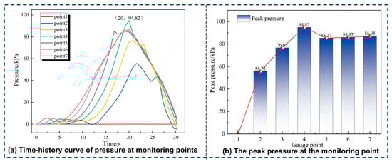 Pressure variation at monitoring points under full methane condition: (a) time–history curve of pressure; (b) the peak pressure.