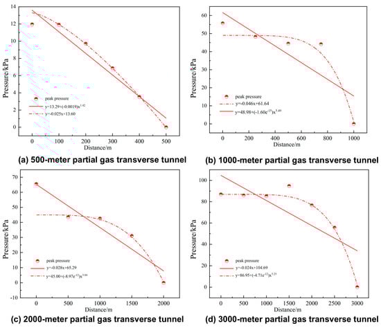 Fitted curves of peak overpressure of explosion shock waves as a function of distance in tunnels of varying lengths: (a) 500 m, (b) 1000 m, (c) 2000 m, and (d) 3000 m.