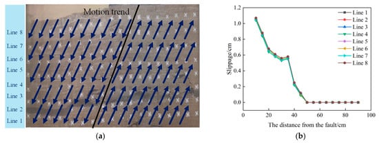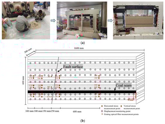 As shown in Figure 1b, the monitoring system includes 184 displacement measurement points and 24 stress sensors. The sensors were mainly deployed in the fault zone and its adjacent areas to capture the stress evolution characteristics under mining disturbance. The simulated mining operation started at a position 90 cm above the fault on the handing wall and ended at a position 10 cm below the fault on footwall. Each coal layer mined was 5 cm in length, representing the actual coal layer mining length of 15 m; the total mining length was 80 cm, representing the actual total coal layer mining length of 240 m. After each mining was completed, it was left to stand for 1 h to ensure the redistribution of the stress field and displacement field. At the same time, optical fiber sensing system and the distributed DH3816 static strain acquisition unit were used to monitor the coordinated changes in stress, strain, and displacement in real time. Data processing was carried out using Surfer 29 software to visualize and dynamically analyze the stress field and displacement field, and a numerical model was constructed using the particle flow software to simulate the formation of faults and the response of the rock mass to mining disturbance. The overall experimental system cannot only reproduce the formation and evolution process of a normal fault but also reveal the multi-physics field coupling effect under mining disturbance.
