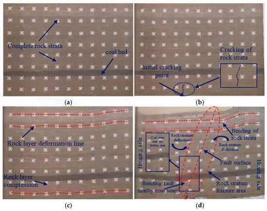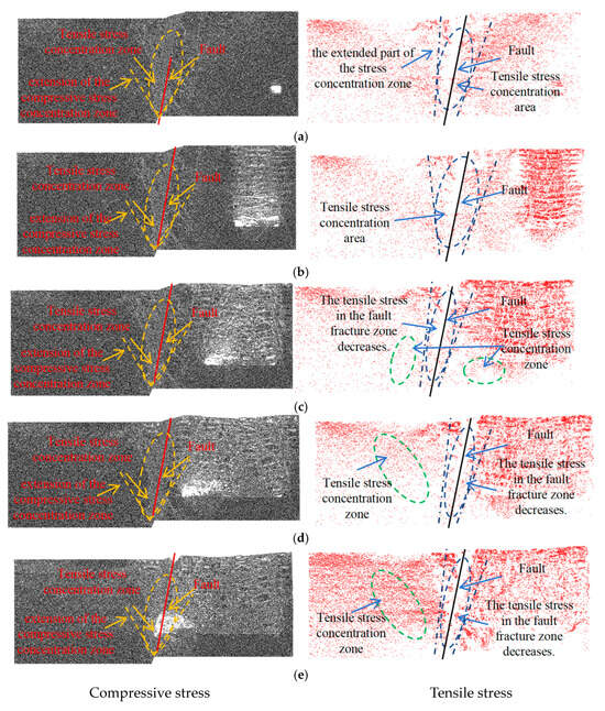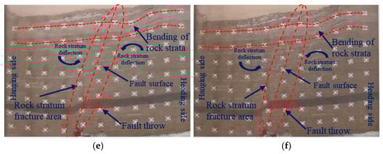 The formation of a normal fault is a complex geological evolution process. Based on the characteristics presented by the experiments, it is divided into five stages: the stage of rock layer compression deformation, the stage of fault initiation, the stage of fault expansion, the stage of fault slip, and the final stable stage. The formation process of a normal fault is shown in Figure 2. In the initial stage, the model rock layer structure was initially intact and there are no obvious macroscopic fractures. Under the action of compensatory load, the overlying rock layer undergoes overall compression deformation, and the internal stress gradually accumulates. When the stress in a local area reaches the strength limit of the rock mass, cracks first initiate at a large inclination angle from the middle and expand to the upper and lower sides, entering the “fault initiation stage”. During this stage, the deformation of the upper and lower parts of the rock layer is obvious, while the cracks in the middle close quickly, reflecting the dynamic evolution process of local shear stress concentration. As the loading test continues, the stress further spreads to the surrounding areas, the non-uniform deformation of the rock layer intensifies, and it enters the “fault expansion stage”. At this time, the loading on the left side of the model generates a significant lateral compression effect, causing the fault plane to expand longitudinally, and the local displacement gap increases; the rock layer shows S-shaped bending folds, and the shear compression effect causes the range of the fault zone to continuously expand, and the fracture area gradually forms and connects. After the formation of the fault, the rock properties and stress state jointly affect its slip response path. In the “fault slip stage”, the fault undergoes displacement deformation along the slip interface, and when the inclination angle reaches above 70°, the coal seam shows significant up-down displacement, forming a typical normal fault structure. The morphology of the fault in this stage is controlled by the mechanical heterogeneity of the rock layer; although the overall trend has a local deflection, it remains continuous and stable. In the final stage, the stress field of the system tends to be balanced, the fractures gradually close, and the morphology of the fault structure tends to be stable. The latter slip caused by the redistribution of stress tends to be alleviated, and the fault enters the compaction consolidation stage. The experimental observations also show that the deformation strength of the rock mass around the fault is much greater than that in the area far from the fault, especially footwall, which is subjected to more severe shear stress, showing more obvious slip and displacement responses.