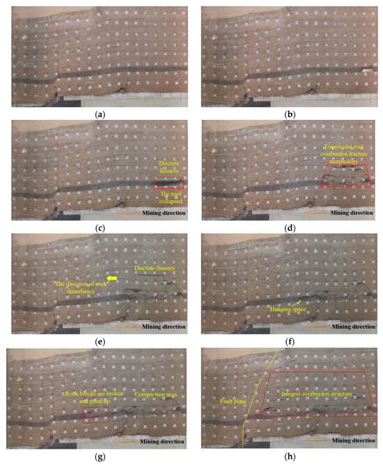 Overburden structure during mining towards the fault direction at the working face of the footwall: (a) Unmined rock mass; (b) 80 cm from the fault; (c) 70 cm from the fault; (d) 55 cm from the fault; (e) 45 cm from the fault; (f) 35 cm from the fault; (g) 20 cm from the fault; (h) 10 cm from the fault.