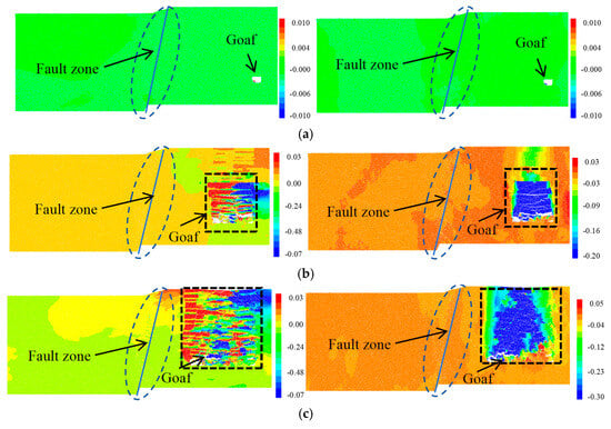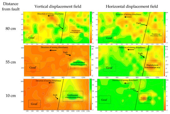 To quantitatively analyze the deformation evolution characteristics of the overlying strata during the back mining process of the fault bottom, the displacement monitoring data were visually processed using the Surfer software, and the vertical and horizontal displacement field distribution maps of the rock layers at different time periods were obtained, as shown in Figure 4. In the initial stage of mining, the overall structure of the overlying strata remained stable, and the displacement variation in the rock layers was relatively small. During this stage, the vertical displacement mainly occurred in the mining void area and the local area above the fault, showing a slight subsidence trend; while the horizontal displacement was limited to the vicinity of the fault bottom, with an extremely small amplitude, indicating that the mining disturbance had not significantly affected the fault structure, and the regional stress field remained in its original state. When the working face advanced to 55 cm away from the fault, the coal mining−induced energy release occurred, causing the stress distribution of the surrounding rock to change. The rock layer above the mining void began to show significant subsidence, forming a typical collapse area, with a significant increase in vertical displacement, especially above the mining void. In contrast, the horizontal displacement remained at a relatively low level and was more dispersed, reflecting that the rock mass mainly underwent vertical deformation caused by gravity during this stage, and the lateral shear was not significant. As the working face further advanced to the vicinity of the fault, the fault structure entered the disturbance core area. At this time, the collapse range of the roof significantly expanded, the overall stability of the rock mass decreased, and due to the weakened supporting capacity, the vertical displacement in some areas actually decreased. At the same time, the rock mass showed a weak horizontal displacement along the working-face advance direction, with a concentrated spatial distribution in the bottom part of the fault zone. This phenomenon indicates that the fault area has undergone significant stress redistribution and slip response, with the displacement evolution trend evolving from unidirectional subsidence to multi-directional coupling, and possessing a complex mechanical regulation mechanism.