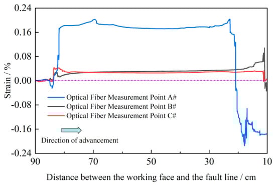 During the mining process of the lower coal seam, the vertical strain within the fault plane shows significant temporal differences, as shown in Figure 5. The A measurement point, which is located at a shallow depth and close to the mining area, experienced the earliest and most significant changes, displaying the largest amplitude; the B measurement point’s response was slightly delayed and had a smaller amplitude; the C measurement point showed the latest and weakest strain changes. This difference mainly results from the adjustment of the rock mass stress distribution caused by mining disturbances. As the working face advances, the vertical strain at each measurement point fluctuates briefly and then gradually stabilizes, and the rock mass gradually reaches a new stress equilibrium. However, when the working face approaches the fault zone further, local stress concentration rapidly increases, and the vertical strain at the three measurement points again experiences intense fluctuations, with point A being the most significant. This sudden increase in strain reflects the coupling effect of fault slip and stress concentration, marking the critical state of the fault entering an unstable failure. Thus, the rock mass close to the fault at the shallow depth is more susceptible to the excitation of mining disturbances, has a more intense strain response, and therefore has higher disaster sensitivity.