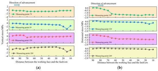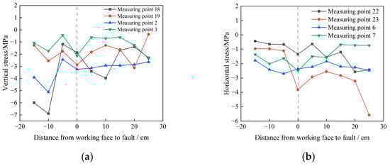 Stress variation trends on both sides of the fault. (a) Vertical stress variation. (b) Horizontal stress variation.