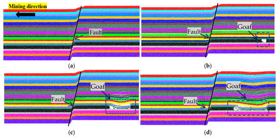 The material properties used in the simulation were calibrated based on experimental data. These properties include the elastic modulus, Poisson’s ratio, cohesion, and friction angle of each rock layer. Specifically, the model uses rock strength and elastic modulus obtained from uniaxial compression tests, ensuring that the material properties align with experimental data, thus guaranteeing the reliability of the simulation results. In the simulation, we used a step-by-step mining approach, extracting 5 cm thick layers of coal at each step to simulate the gradual disturbance of the actual mining process. The loading conditions at each step reflect the progression of mining and track the evolution of the stress field, displacement field, and fault slip behavior in the rock layers. The numerical simulation results were compared with physical experimental data to validate the model’s accuracy. The simulation successfully reproduced the fault evolution process, including initial compressive deformation, fault initiation and propagation, and the final stabilization phase. The stress redistribution and fault slip patterns in the simulation were consistent with the behavior observed in the experiments, demonstrating the effectiveness of the numerical model.