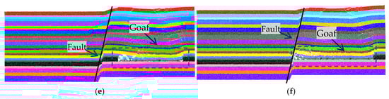 Mining towards the fault direction at the footwall working face: (a) unexcavated rock strata; (b) 195 m from the fault; (c) 135 m from the fault; (d) 90 m from the fault; (e) 45 m from the fault; (f) 0 m from the fault.