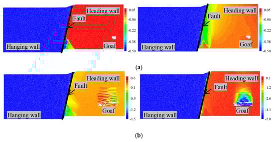 Stress variations during mining at the footwall of a normal fault: (a) vertical stress; (b) horizontal stress.