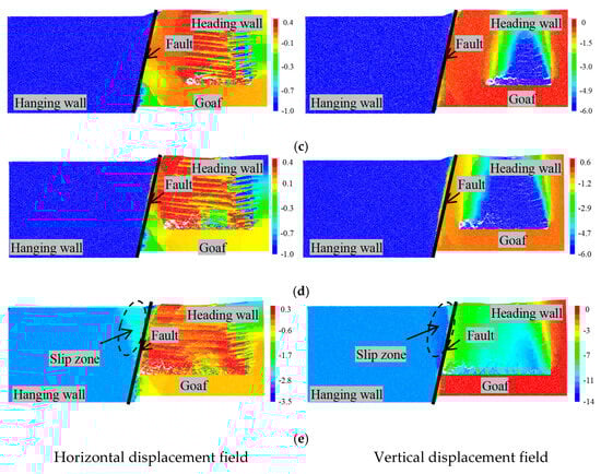 Displacement field distribution during mining towards the fault direction at the Heading Wall Working Face (unit: m): (a) 195 m from the fault; (b) 135 m from the fault; (c) 90 m from the fault; (d) 45 m from the fault; (e) 0 m from the fault.