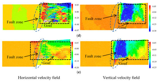 Distribution of velocity field during mining towards the fault direction at the footwall working face: (a) 195 m from the fault; (b) 135 m from the fault; (c) 90 m from the fault; (d) 45 m from the fault; (e) 0 m from the fault.