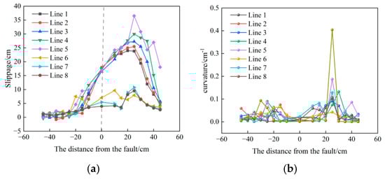 Relationship between displacement and curvature with distance from the fault. (a) Vertical displacement changes after normal fault mining. (b) Curvature changes between layers.