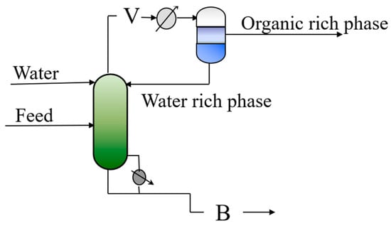 Several studies have reported that the idea of EHAD, as a hybrid separation technology, can achieve effective separation without the addition of an external entrainer when the original feed itself is capable of forming a heterogeneous azeotrope. Zhao et al. [12] investigated the separation of ethanol, toluene, and water by heterogeneous azeotropic distillation, using toluene, which was already present in the mixture as the entrainer. Similarly, Wu et al. [13] designed a comparable configuration for the separation of a hexane/methanol mixture. Luyben [14] demonstrated this principle using a simple two-column distillation system to separate an n-butanol/water mixture, and found that the extractive distillation process was more economical than pressure-swing distillation (PSD). Cui et al. [15] and Tsai et al. [16] also studied the energy integration possibilities in the case of a hybrid separation system, containing multiple distillation columns. The separation of a benzene/isopropanol/water system with varying feed compositions in a hybrid separation system confirmed the feasibility and efficiency of the energy integration alternatives. However, they did not describe the conditions of the alternatives, and their system contained multiple distillation columns. These studies collectively demonstrate the potential of utilizing system-inherent components as autoentrainers. EHAD is illustrated in Figure 1.
