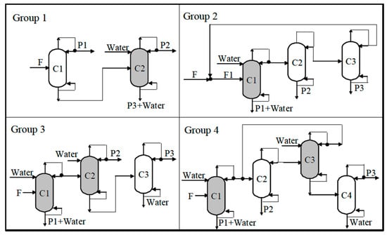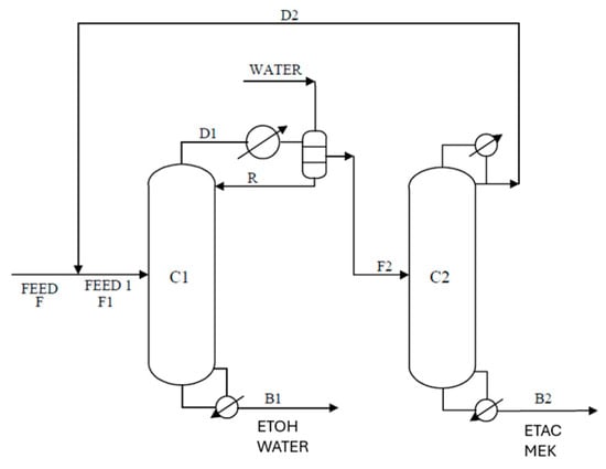 The separation of this quaternary mixture can be approached in different ways, one of which is to divide it into two binary subsystems. Mizsey [29] proposed a two-column configuration capable of splitting the mixture into a water-ethanol system and an ethyl acetate-methyl ethyl ketone system, as illustrated in Figure 3. Building on this concept, Rév et al. [30], conducted detailed investigations of the two-column design, explaining its operation through comprehensive vapor-liquid–liquid equilibrium analyses. Once the quaternary mixture is divided into these two binary systems, their subsequent separation can be accomplished using well-established conventional methods.