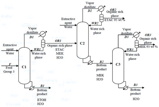 Szanyi et al. [10,17] also investigated the printing company’s solvent mixture and classified it as belonging to Group 3. The corresponding separation structure they proposed is presented in Figure 2. To achieve complete separation, the process employs two EHAD columns, one heteroazeotropic distillation and one conventional distillation. A key factor in this design is the precise positioning of the EHAD units within the separation train, as their placement critically determines the efficiency and feasibility of the process. Due to the vapor-liquid–liquid equilibrium (VLLE) characteristics of the system, EHAD must be applied twice, as illustrated in Figure 4, to ensure successful separation.