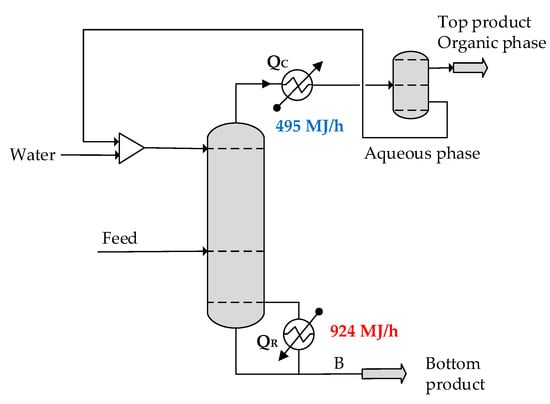 The relatively big difference between the heat loads is due to the sensible heat requirement of the cool “water-rich phase” fed back as reflux flow, together with the additional water to the column.