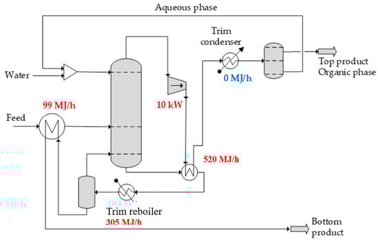 The calculated energy requirement must be adjusted to account for the efficiencies of the compressor, motor, and other auxiliary equipment. These corrected values are verified using ChemCAD 8 simulations. The compressor output pressure is 2.7 bar. However, the temperature of the compressed stream is 5 °C higher than initially assumed. The compression energy increases the heat content of the flow. The results for the integrated case are summarized in Table 8 and illustrated in Figure 7. The figure also depicts the trim condenser and reboiler, which are essential during start-up and normal operation, as the heat supply and demand are rarely perfectly balanced. These auxiliary devices ensure stable operation and compensate for fluctuations in thermal loads.