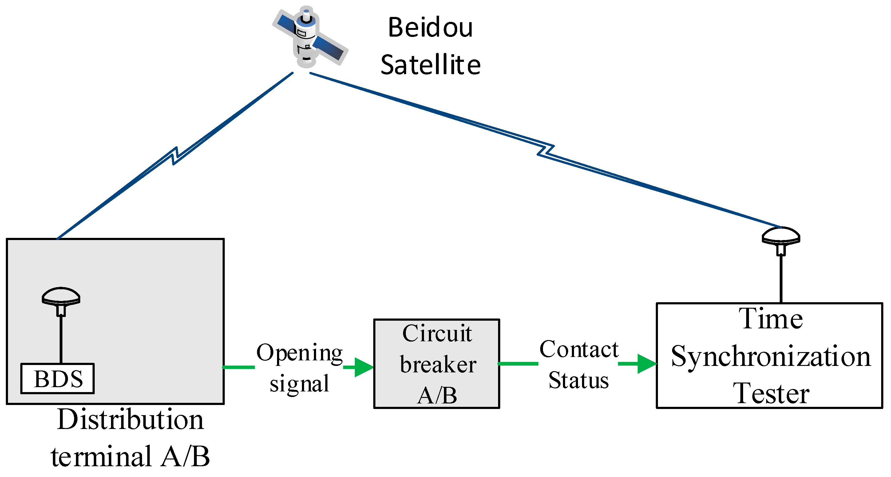- Before starting the test, first ensure that both power distribution terminals are synchronized and operating stably for over 10 min under the synchronized time reference output by the satellite signal simulator to establish a reliable synchronized state.
