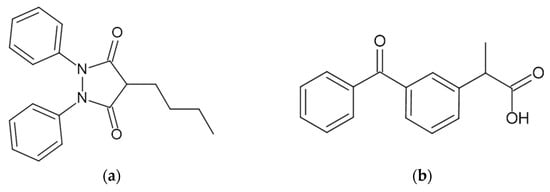 Chemical structures of (a) phenylbutazone (PHB) and (b) ketoprofen (KP). The molecular structures were drawn using ChemSketch software, version 12.1.0.31258.