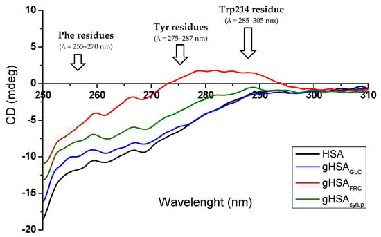 Near-UV CD spectra of HSA, gHSAGLC, gHSAFRC, and gHSAsyrup (1.30 × 10−5 mol∙L−1) in the range of λ 250–310 nm, with the characteristic spectral regions corresponding to Phe, Tyr, and Trp214 residues.