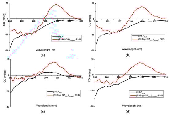 Near-UV CD spectra of (a) non-glycated HSA and (b–d) glycated albumins, in the absence and presence of PHB, at a ligand/albumin molar ratio of ~8:1.