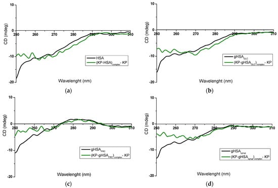 Figure 3 presents distinct differences in both the intensity and shape of the near-UV CD spectra recorded for free serum albumin (“albumin”) and its complexes with phenylbutazone (“(PHB–albumin)complex—PHB”). These spectral changes are noticeable for the non-modified HSA (Figure 3a) as well as for modified HSA, regardless of the glycation agent used: gHSAGLC (Figure 3b), gHSAFRC (Figure 3c), and gHSAsyrup (Figure 3d). The formation of the KP–albumin complex also induced changes in the near-UV CD spectra compared to free albumin (Figure 4a–d); however, the magnitude of these changes was smaller than that observed for the PHB–albumin complexes.