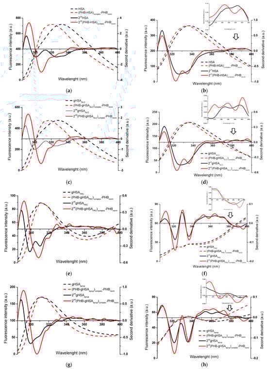 Fluorescence emission spectra of (PHB–albumin)complex—PHBnorm normalized to the maximum fluorescence intensities of albumin, with the corresponding second-derivative spectra (2nd) for (a,b) HSA and (c–h) glycated albumins; λex 275 nm (left panels) and λex 295 nm (right panels). Insert: detail of the Trp214 region (370–400 nm); ligand-to-albumin molar ratio of ~15:1.