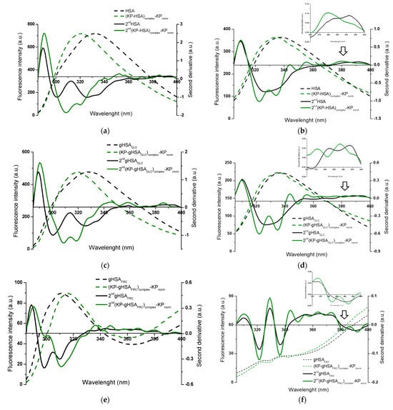 The diagrams below illustrate fluorescence emission and the second-derivative spectra of native and glycated albumins, free or complexed with PHB (Figure 5) and KP (Figure 6). Prior to obtaining the second-derivative spectra (2nd (ligand–albumin)complex—ligandnorm), the fluorescence spectra of each (ligand–albumin)complex—ligand were normalized to the corresponding maximum fluorescence intensity of free albumin.