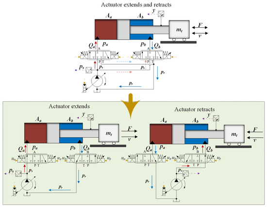 Another motivation of this study is that the existing control methods mainly focus on the actuator’s control accuracy improvement while ignoring the system energy efficiency. Using the independent metering hydraulic system [27,28], the decoupling control of the pressure of the two capacitive cavities can be realized by employing multiple spools to control the flow rate of the actuator inlet and outlet independently, thus reducing the oil supply pressure of the pump source and achieving a certain energy-saving effect [29,30,31]. Thus, the control system must not only handle the aforementioned nonlinear models and uncertainties, but also incorporate energy-saving characteristics while ensuring high accuracy to effectively improve the system’s energy efficiency.