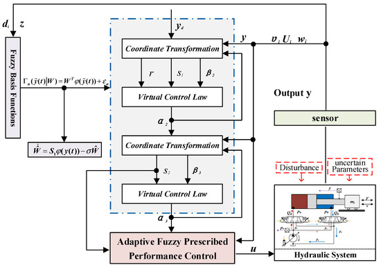 Unmodeled dynamics and external disturbances represent inherent challenges that complicate the design of controllers and may adversely affect the stability of closed-loop control systems [13,14,15]. Previous work on output feedback tracking for nonlinear time-delay systems has utilized adaptive neural networks to mitigate the effects of unknown nonlinearities [16,17]. Similarly, a fuzzy logic system (FLS) was applied in [18] to estimate uncertainties within the system and achieve high-precision tracking performance. In recent years, numerous studies have integrated neural networks or FLSs with adaptive control strategies to handle uncertainties in nonlinear functions, leading to extensive advances in this area [19,20]. The concept of prescribed performance control (PPC) was initially introduced by the Greek scholar G. Rovithakis et al. [21] and has since evolved into a widely adopted methodology for constraining state tracking errors in hydraulic systems. The core principle of PPC involves designing a prescribed performance function (PPF), typically an adjustable exponential decay function, to enforce the desired transient and steady-state performance [22,23,24]. As system variables (e.g., output signals or tracking errors) approach predefined bounds, the controller adjusts accordingly to prevent the violation of these constraints, thereby maintaining consistent performance specifications. To achieve accurate tracking under time-varying disturbances and parametric uncertainties while complying with preset performance criteria, PPC has been combined with adaptive control techniques. This integration has proven effective in attaining robust and precise tracking in hydraulic servo systems [25,26].