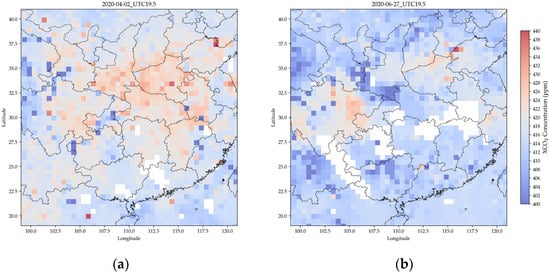 Multi-source satellite-fused XCO2 data used for assimilation in this study: (a) 19:30 UTC on 2 April 2020; (b) 19:30 UTC on 27 June 2020. (Data source: Jin et al. [49]).