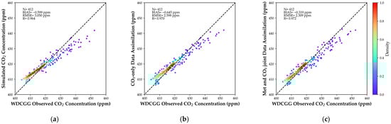 Comparison of WRF-Chem simulated and assimilated CO2 concentrations with WDCGG station observations; (a) Comparison between CTRL and observations, (b) Comparison between CO2_DA and observations, (c) Comparison between FULL_DA and observations.