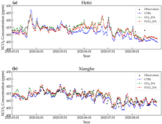 The WRF-Chem simulated and assimilated CO2 concentrations were compared against observations from WDCGG. Figure 6 presents time series comparisons between observed CO2 concentrations and those simulated by the CTRL, CO2_DA, and FULL_DA experiments at four WDCGG sites from March to August 2020. In the figure, black triangles represent observed values, the blue line denotes CTRL, the green line represents CO2_DA, and the red line indicates FULL_DA.