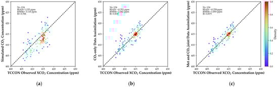 Comparison of WRF-Chem simulated and assimilated CO2 concentrations with TCCON site observations; (a) Comparison between CTRL and observations, (b) Comparison between CO2_DA and observations, (c) Comparison between FULL_DA and observations.