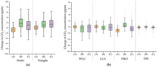 We quantified the impacts of assimilating CO2 alone, incrementally assimilating meteorological variables, and jointly assimilating both on the simulation results by computing the three differential terms: (CO2_DA − Sim), (FULL_DA − CO2_DA), and (FULL_DA − Sim). Figure 10 displays their respective spatial distributions of concentration differences. The results clearly illustrate that the impact of assimilating CO2 is greater than that of assimilating meteorological data alone. This is particularly evident at the Xianghe site, where the changes induced by meteorological assimilation are mostly confined to the range of −2 to 2 ppm, while CO2 assimilation leads to more substantial adjustments, ranging from −3 to 6 ppm. The combined assimilation of both data types demonstrates the most substantial improvement in simulating XCO2 concentrations, with changes spanning −4 to 7 ppm, effectively reducing the bias compared to the ground-based observations. The combined assimilation of both data types demonstrates the most substantial improvement in simulating XCO2 concentrations, effectively reducing the bias compared to the ground-based observations.