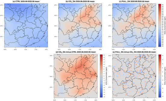 Based on hourly XCO2 concentration data simulated using the WRF-Chem model from March to August 2020, we calculated the monthly averages for the periods of March–May and June–August and analyzed their spatial distribution characteristics. The results clearly show that the spatial patterns of XCO2 concentrations vary across the three simulation schemes—CTRL, CO2_DA, and FULL_DA. Difference analyses reveal that assimilating multi-source satellite remote sensing data improves the simulation of XCO2 concentrations, particularly over most areas in central and eastern China, where assimilation leads to increases of 4–9 ppm, with some localized improvements exceeding 10 ppm. In contrast, the impact of meteorological data assimilation on XCO2 concentration is relatively limited, with changes generally within ±2 ppm. These findings indicate that optimizing the initial CO2 field plays a dominant role in XCO2 simulations, while meteorological assimilation provides supplementary refinement. This study offers a methodological reference for building a more accurate carbon data assimilation system for China and provides technical support for the application of future satellite CO2 observations and regional carbon budget assessments.