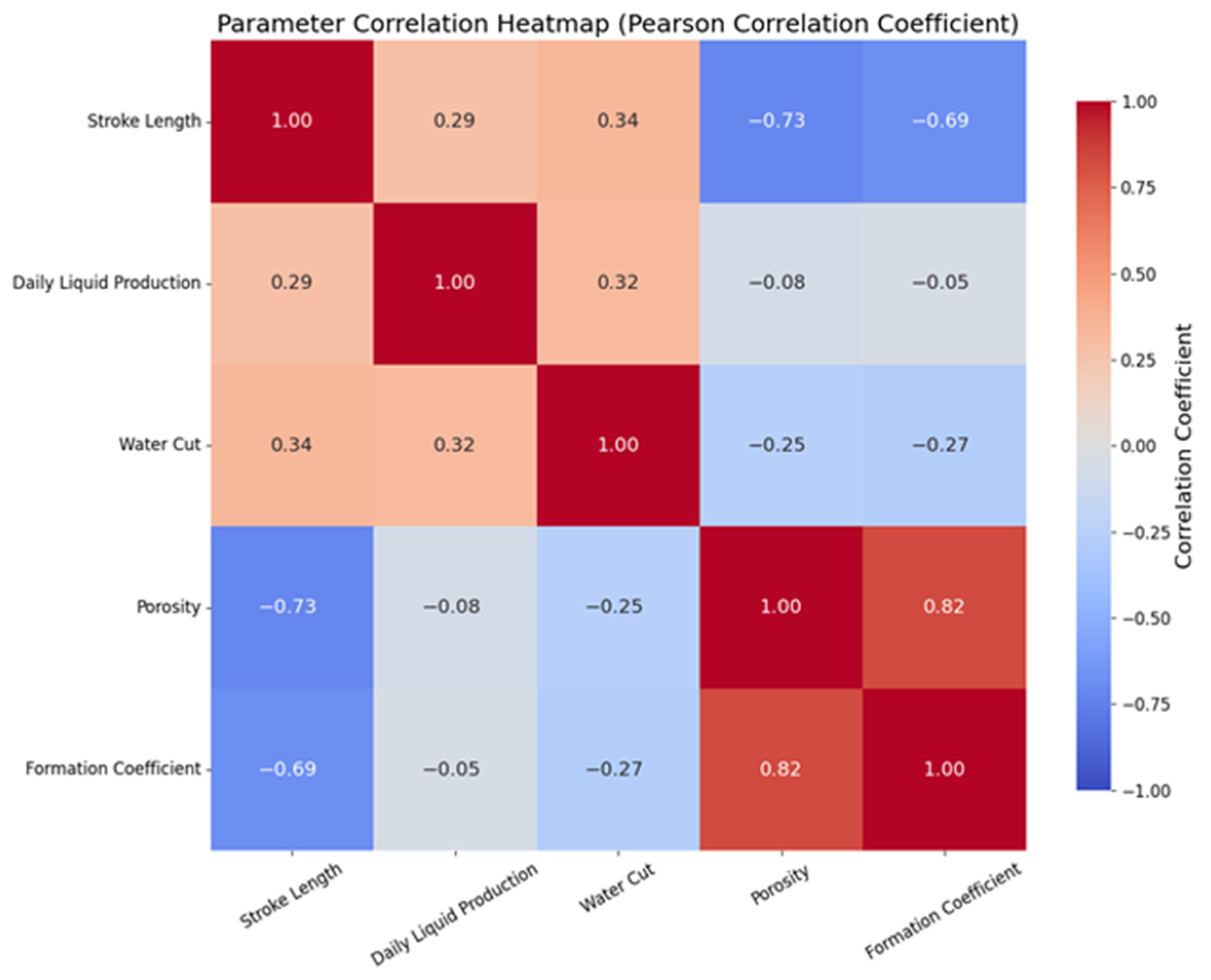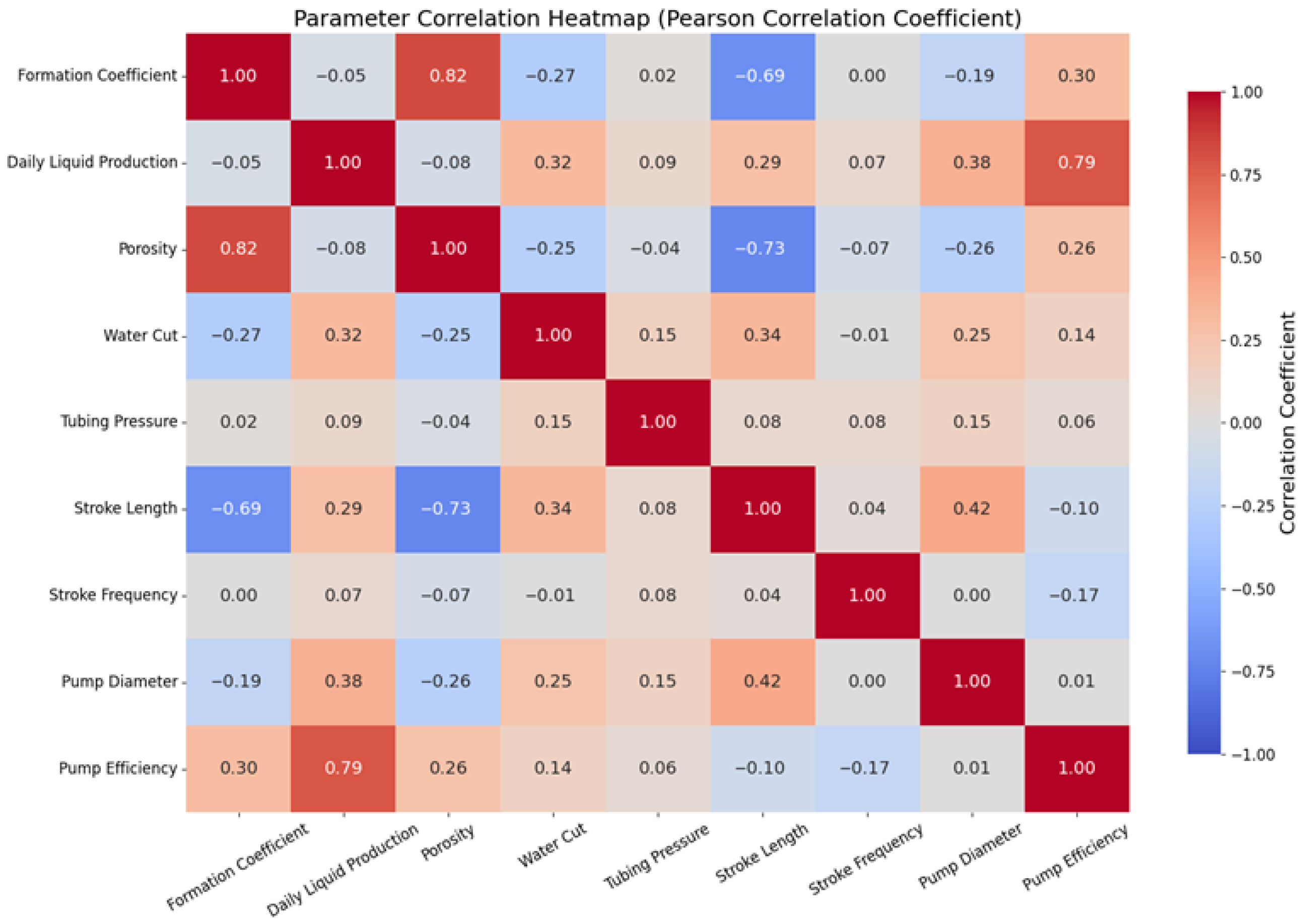 Based on the 19 production parameter data collected, namely “Well Number”, “Intermittent Pumping Type”, “Block”, “Horizon”, “Gas-Oil Ratio”, “Crude Oil Viscosity”, “Stroke Length”, “Stroke Frequency”, “Pump Diameter”, “Pump Efficiency”, “Submergence”, “Daily Oil Production”, “Daily Liquid Production”, “Water Cut”, “Tubing Pressure”, “Porosity”, “Formation Coefficient”, “Flowing Bottom-Hole Pressure”, and “Pay Zone”, the Pearson analysis method is used to screen key parameters, revealing the linear correlation between equipment operating parameters and production indicators and providing data support for the optimization of the intermittent pumping system.