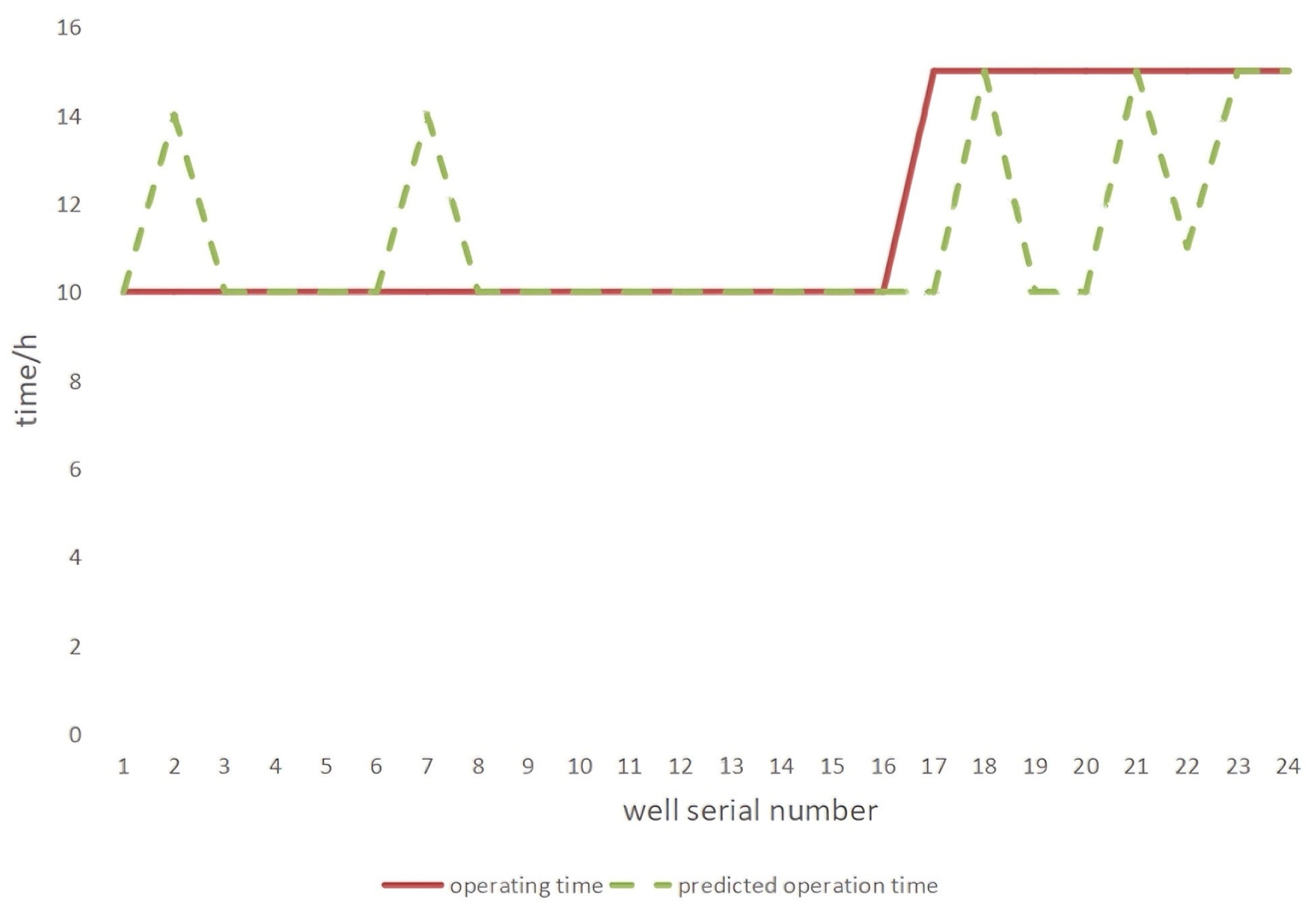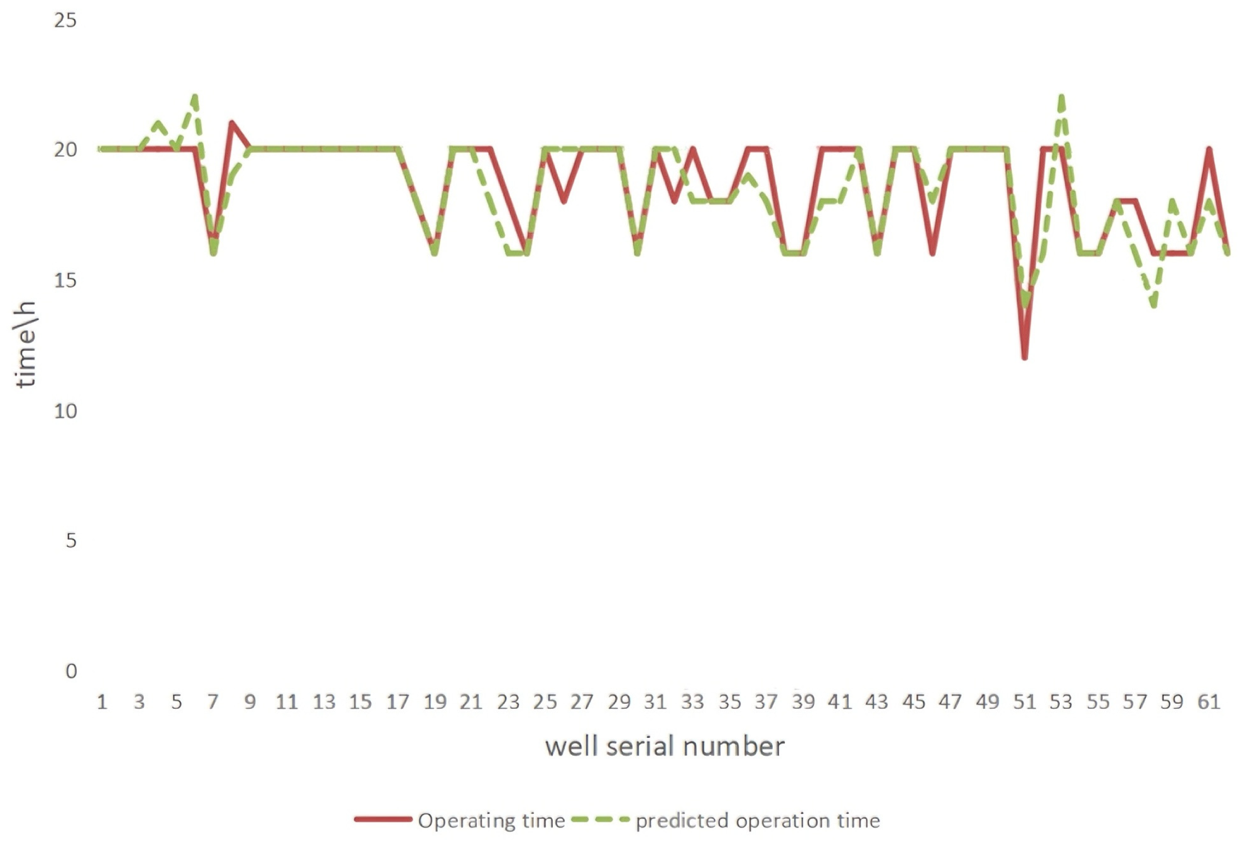 Figure 3), we can observe the correspondence and fluctuation trend between the running time and the predicted running time for different well numbers, and clearly judge the accuracy of the model in predicting each well number in the large-interval pumping wells scenario. The comparison graph of small-interval pumping wells (