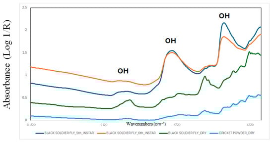 Different vibrational techniques have been evaluated for their ability to predict the chemical composition of foods and feeds [23,24,25]. The most widely used techniques are near-infrared (NIR, 750–2500 nm), mid-infrared (MIR, 1400–3000 nm), and Raman spectroscopy [26,27,28,29]. More recently, hyperspectral imaging (HSI), an analytical method that integrates imaging technology with spectroscopy, has also been used for this purpose [26]. However, other techniques, including infrared microscopy and fluorescence, have also been evaluated to characterise edible insects [30]. Applications and implementation of these techniques require the utilisation of chemometrics or machine learning (ML) [31,32]. Chemometrics and ML algorithms are used to interpret collected spectral data and develop models for quantitatively or qualitatively analysing samples [31,32]. The implementation of these techniques, in combination with ML, required preprocessing, training, and internal and external validation of the spectral data to construct the model and evaluate its future performance [33,34,35]. Figure 1 showed the NIR spectra of BSFL (Hermetia illucens) collected at two instars, as well as both BSFL and cricket dry powder samples. The figure shows that the NIR spectra provides us with information about the chemical characteristics of the samples. Absorbances in wavenumbers related to O-H bonds (around 8300 cm−1, 6800 cm−1, 5000 cm−1) are associated with water or moisture content, wavenumbers related to C-H bonds (between 5600 and 5700 cm−1, and above 5000 cm−1) are associated with carbohydrates, lipids, or fatty acids, and wavenumbers related to N-H bonds (around 6900, 6700, 5000, 4800 cm−1) are associated with protein content or amino acids. Other chemical characteristics or properties can also be associated with different wavenumbers or functional groups [26,27,28,29].