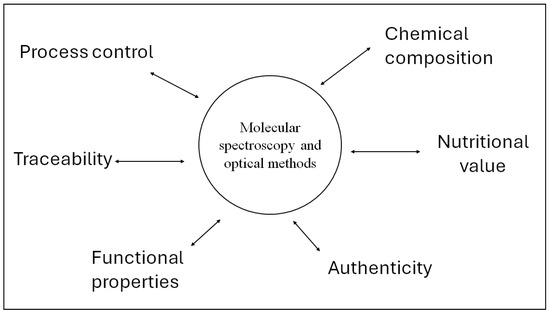 A recent area of interest in the application of these analytical techniques is associated with the ability of these techniques to be used for monitoring different processing parameters [38,39]. Process monitoring or process analytical technologies (PAT) can be incorporated into the production line for the online analysis of insect larvae, enabling producers to monitor and optimise rearing conditions and composition [38,39]. Figure 2 schematically summarises the different applications of vibrational spectroscopy in the edible insect’s feed and food industries.