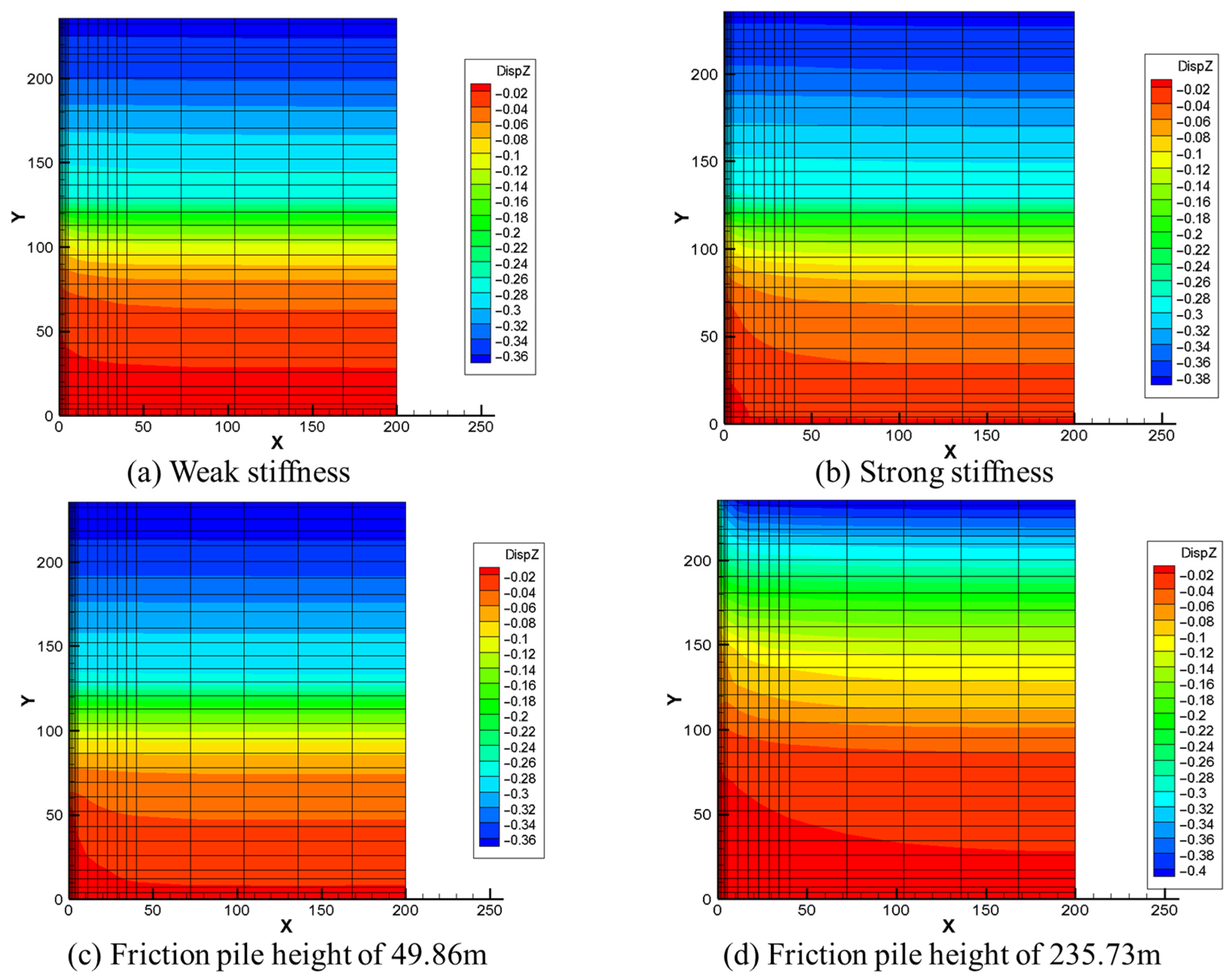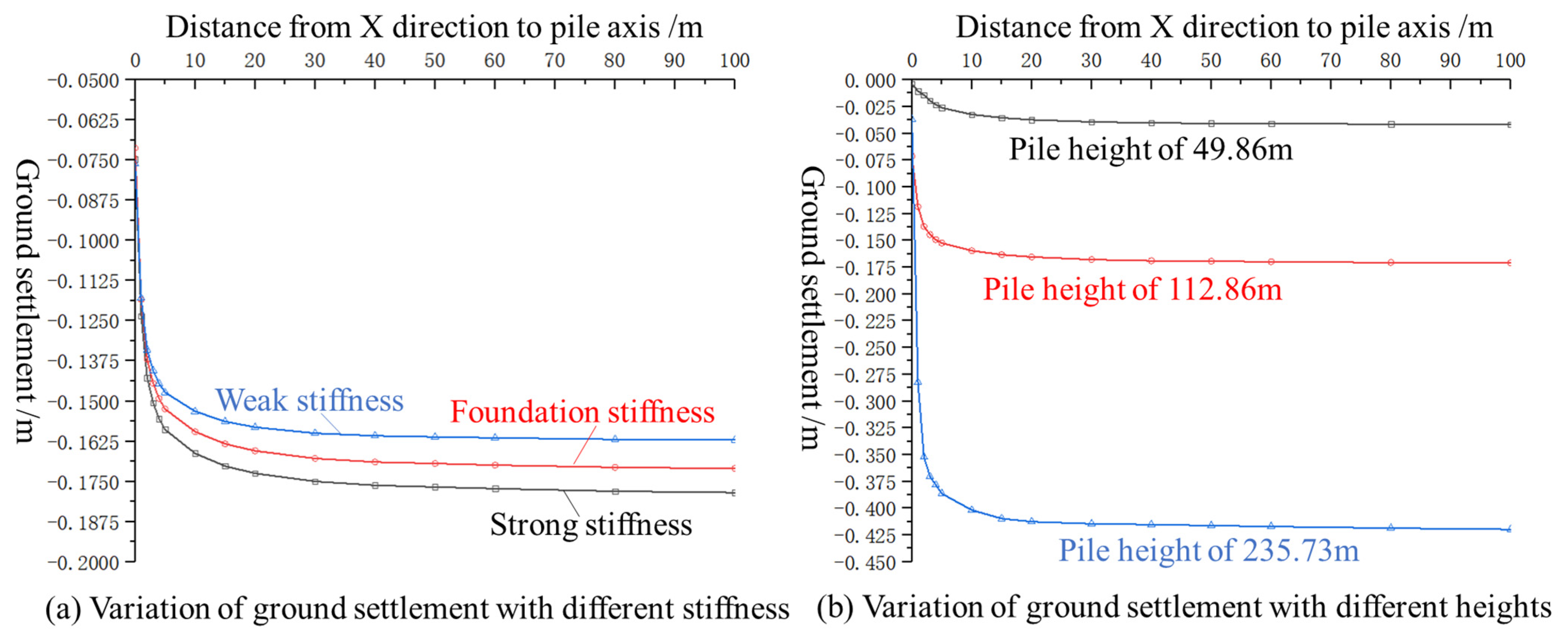 | Scheme | Friction Pile Height (m) | Stiffness Coefficient | Stable Settlement at Failure Point (m) | Settlement at 1 m Radial Distance from Pile (m) | Reduction Percentage |