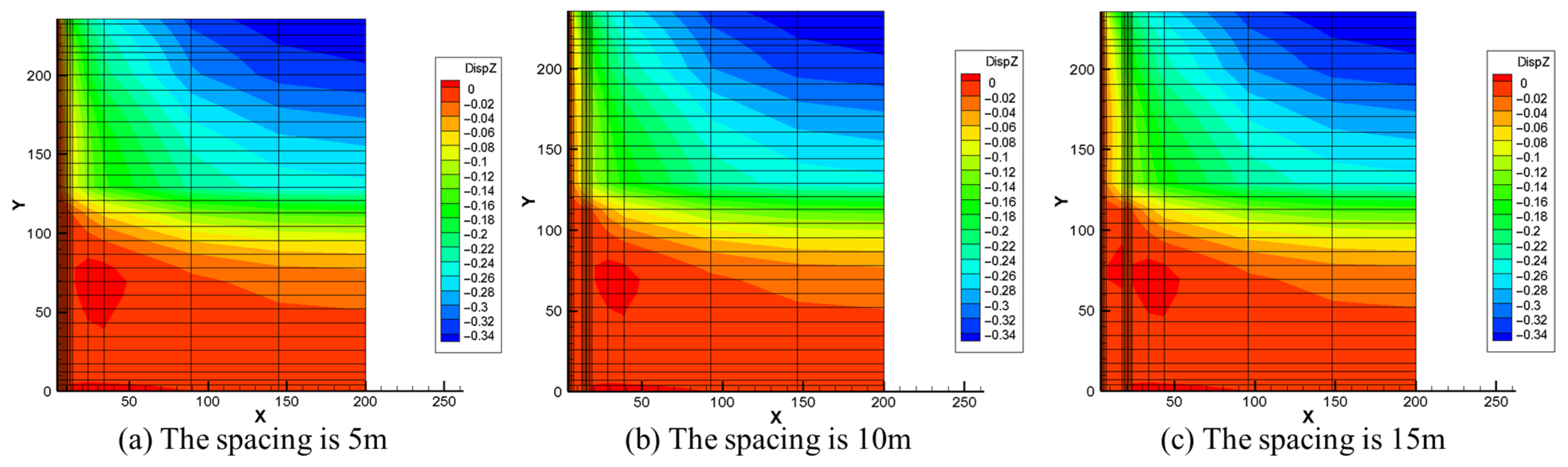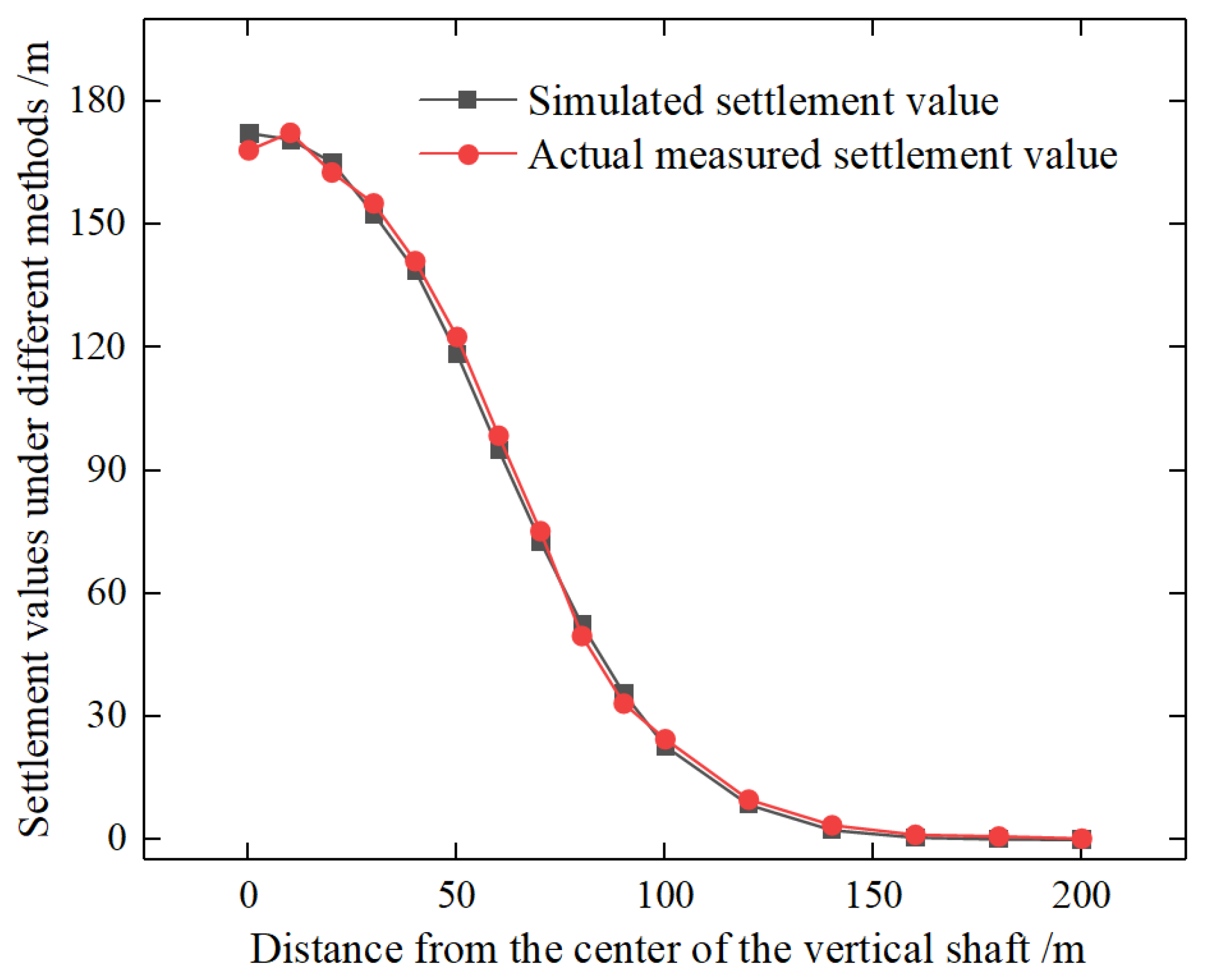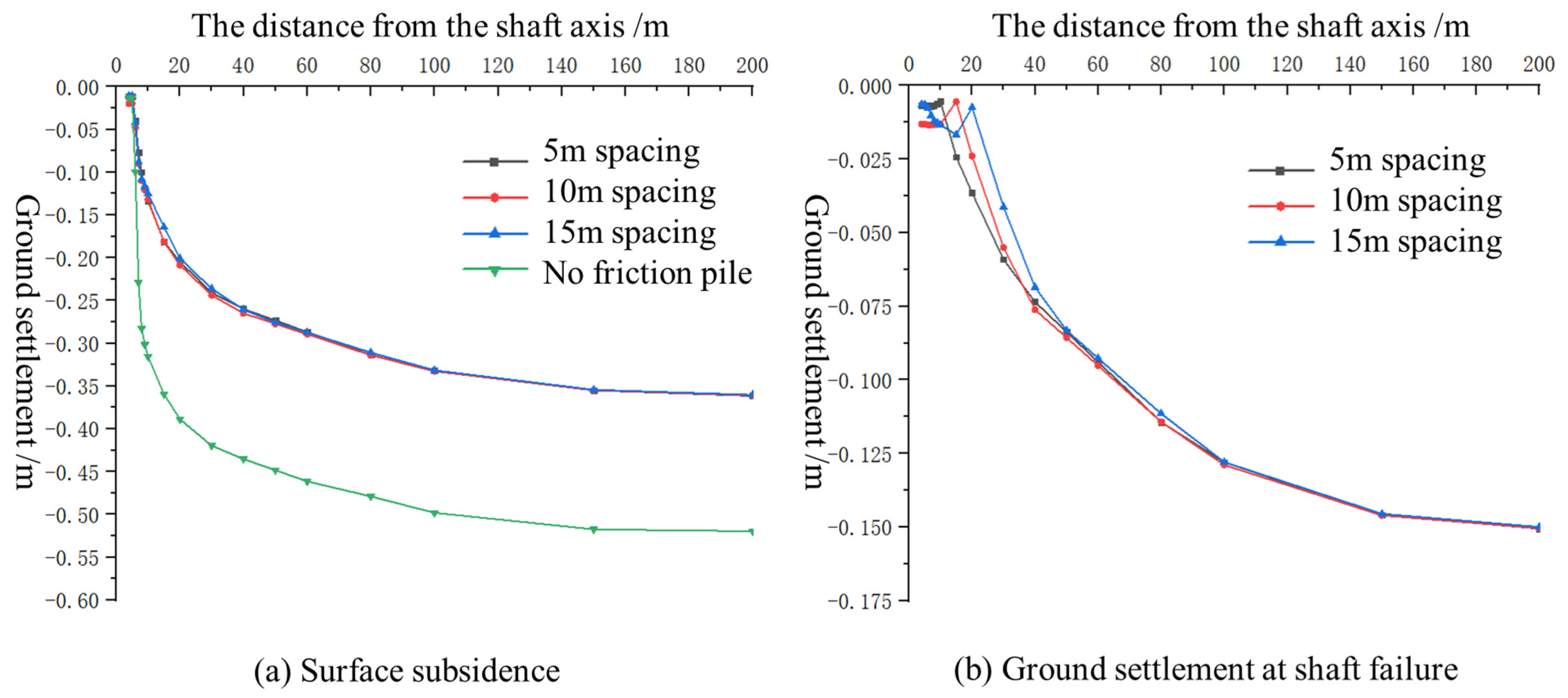 | Scheme | Friction Pile Height/m | Distance from Shaft to Pile/m | Stable Settlement at Failure Point/m | Settlement at 1 m from Shaft Wall/m | Reduction Percentage |