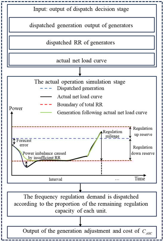To evaluate the actual operation performance of the system under the given dispatch plan, an automatic generation control (AGC)-based actual operation simulation is carried out based on the dispatched generation results, the regulation reserves (RR) allocated to each generator, and the actual net load curve.