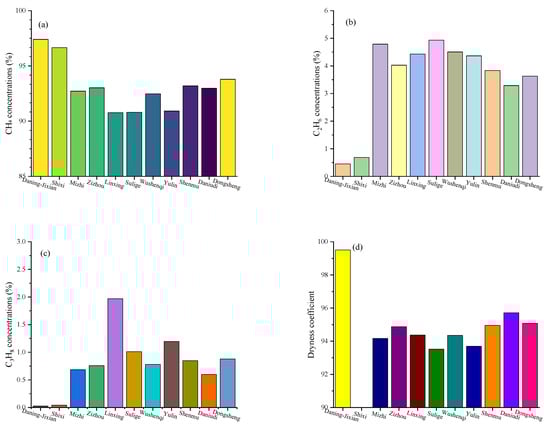Comparative analysis of average hydrocarbon gas parameters between the Daning–Jixian Block and other gas fields. (a) Comparative analysis of average CH4 concentrations; (b) comparative analysis of average C2H4 concentrations; (c) comparative analysis of average C3H8 concentrations; (d) comparative analysis of average dryness coefficient.