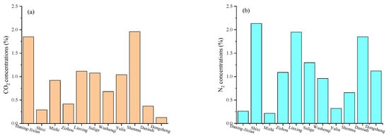 Comparative analysis of average non-hydrocarbon gas parameters between the Daning–Jixian Block and other gas fields. (a) Comparative analysis of average CO2 concentrations; (b) comparative analysis of average N2 concentrations.