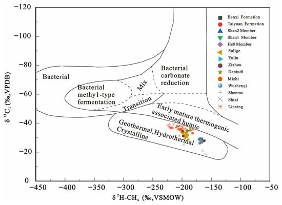 In the present study, the classical Whiticar diagram based on δ13C1 and δ2H-CH4 was employed [38]. Results demonstrate that all gas samples from the Daning–Jixian Block and other gas fields across the Ordos Basin fall within the domain of geothermal, hydrothermal, and crystalline gases. This suggests that the gas genesis is related to the interaction of over-mature organic matter with external hydrogen [20] (Figure 4).