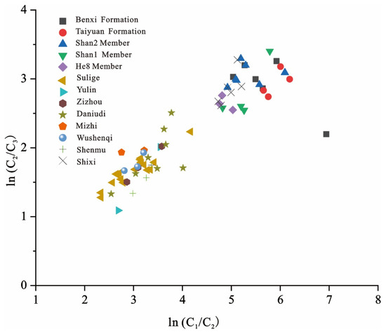 The primary cracking of kerogen marks the stage of abundant methane generation, leading to a rapid increase in the methane-to-ethane concentration ratio. In contrast, crude oil-cracked gas shows a significant increase in propane content. Therefore, the cross-plot of ln(C1/C2) versus ln(C2/C3) is often used as a key indicator for genetic characterization of natural gas [40,41,42]. The natural gas from the Daning–Jixian Block demonstrates markedly elevated ln(C1/C2) and ln(C2/C3) relative to other gas fields, a phenomenon attributed to its advanced thermal evolution stage. The variation range of ln(C2/C3) differs among formations, with the Benxi Formation and Shan1 Member showing a larger range, suggesting that the tight gas accumulation was predominantly sourced from the primary cracking of kerogen, with a potential minor contribution from crude oil-cracked gas (Figure 6).