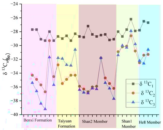 The ethane carbon isotope signature (δ13C2) serves as a key proxy for discriminating between coal-derived gas and oil-derived gas, employing a widely recognized benchmark wherein values heavier than −28‰ are diagnostic of the former, and values lighter than −28‰ suggest the latter [47]. However, all δ13C2 values in the Daning–Jixian Block are less than −28‰ (Figure 8). This is attributed to the exceptionally high thermal maturity, which has caused reversal of the ethane carbon isotope values, leading to the lighter ethane carbon isotope signatures observed [29]. This aligns with the findings of Peng et al. [50], who reported that both coal-derived gas and oil-derived gas exhibit alkane gas carbon isotope sequence reversal during the high-maturity-to-over-mature stage. Consequently, the ethane carbon isotope value alone cannot be reliably used for delineation of the natural gas provenance in the study area.