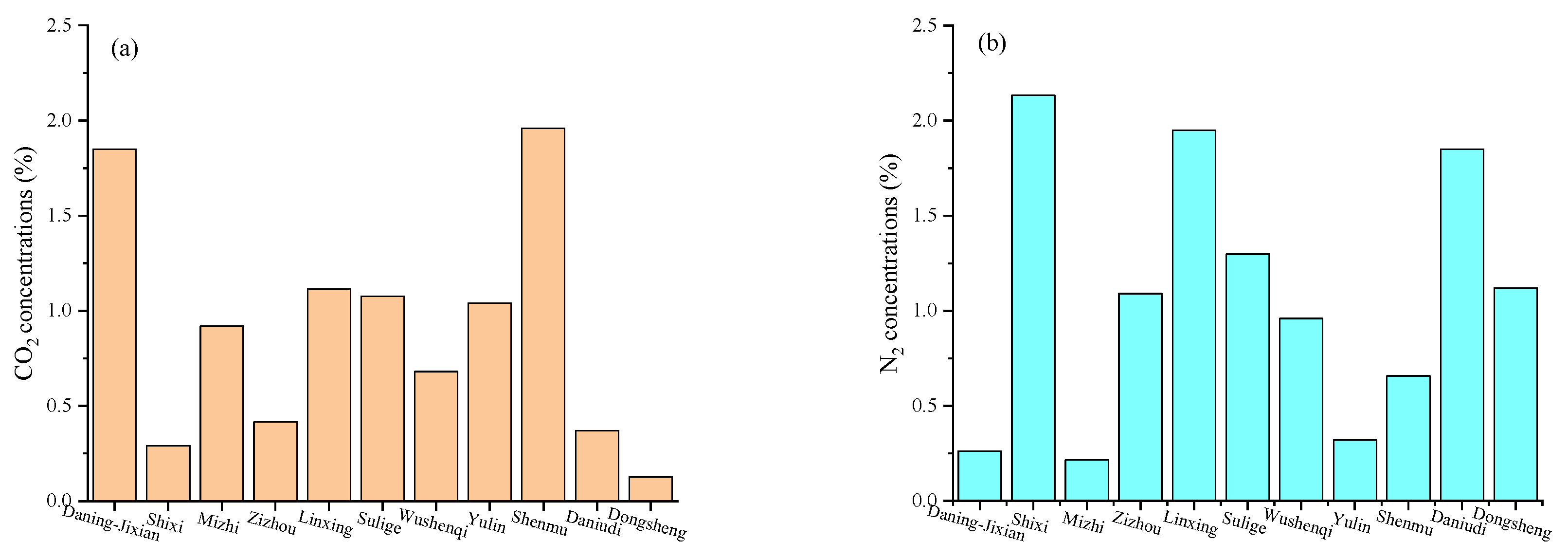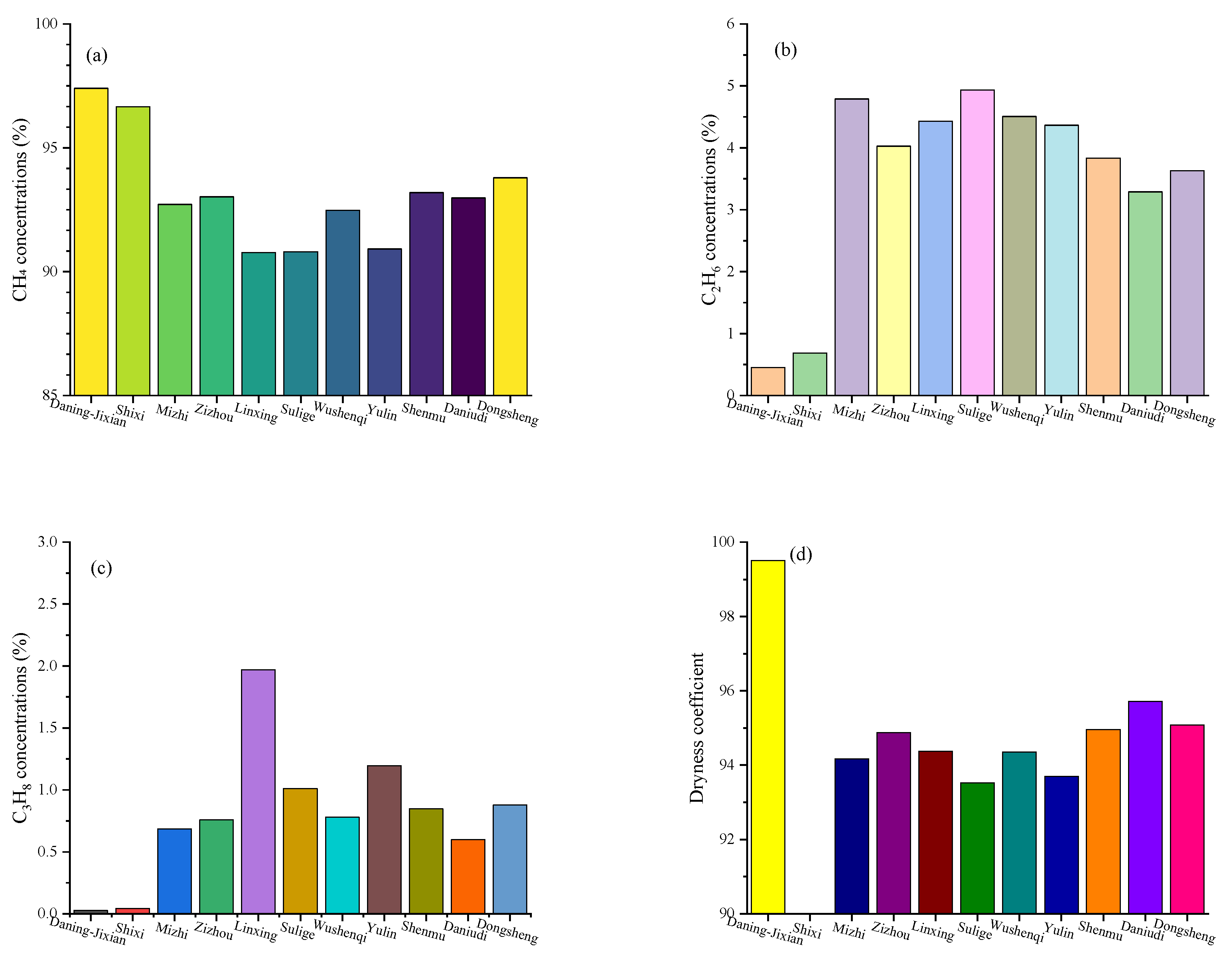 - Comparative assessment with other gas fields across the Ordos Basin indicates that the Daning–Jixian Block exhibits a comparatively higher average methane concentration. The average ethane and propane concentrations in the Daning–Jixian Block are notably lower than those in other gas fields. Furthermore, the dryness coefficient of the gas in the Daning–Jixian Block is significantly greater than that observed in other gas fields. The generally lower CO2 and higher N2 content observed in He8 Member and Shan1 Member suggest vertical migration of natural gas into these intervals.