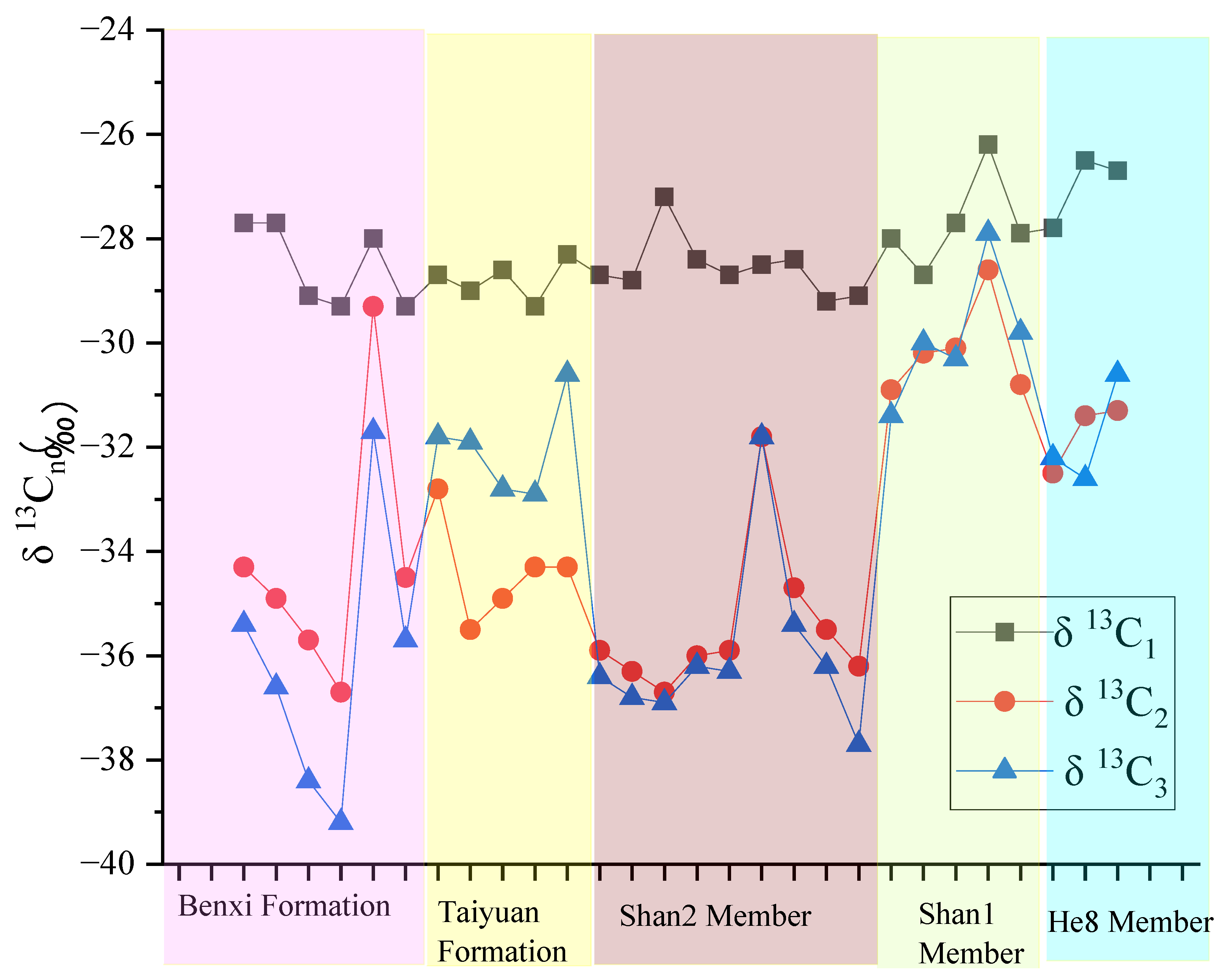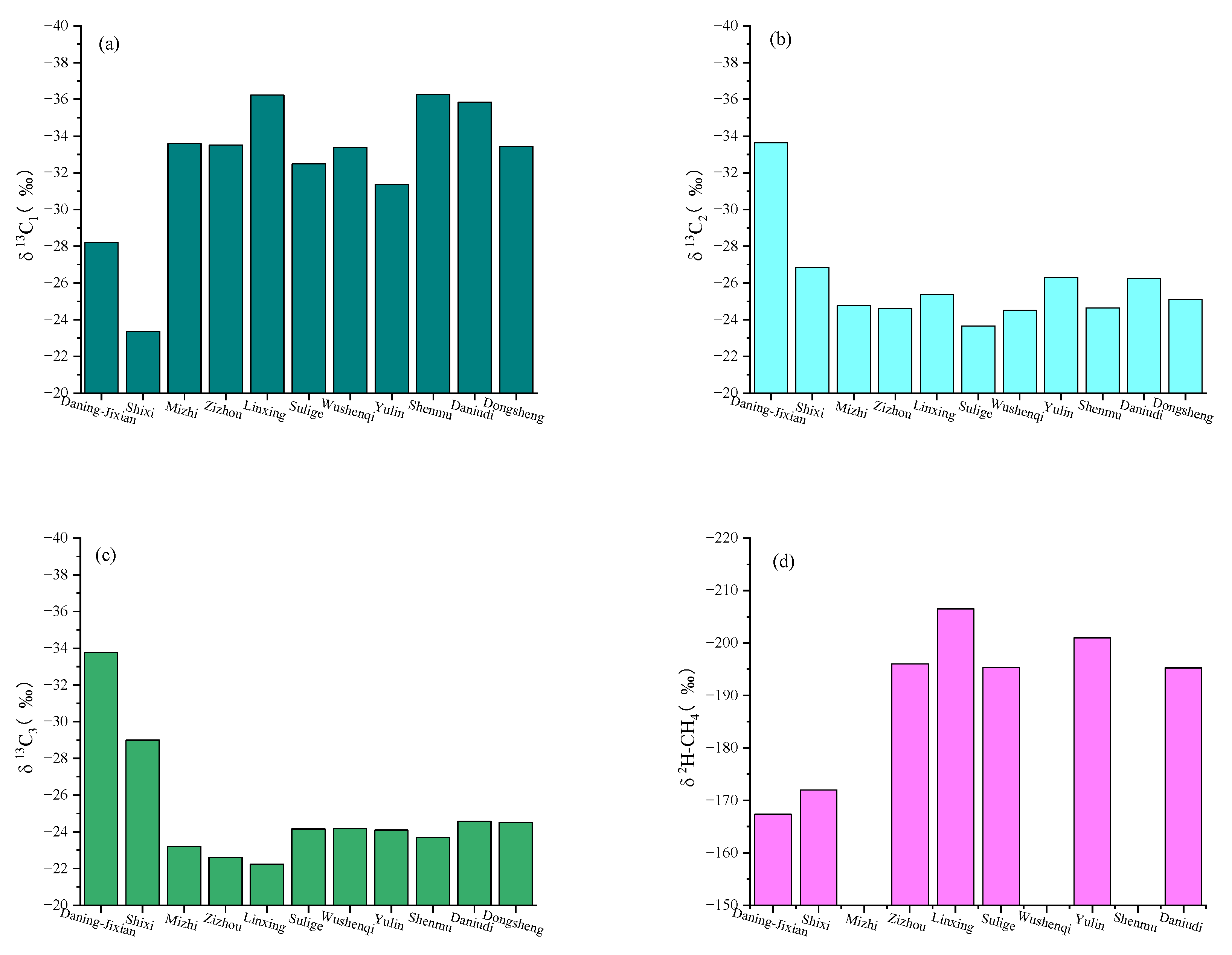 - The natural gas in the Upper Paleozoic tight sandstone gas reservoirs of the Daning–Jixian Block exhibits average δ13C1, δ13C2, and δ13C3 values of −28.20‰, −33.64‰, and −33.77‰, respectively. The average δ13C1 value is heavier compared to other gas fields, while the average δ13C2 and δ13C3 values are significantly lighter. The average δ2H-CH4 value is heavier than that of other gas fields. The relatively heavier isotopic values observed in He8 Member and Shan1 Member compared to other layers suggest a complex scenario involving both dynamic fractionation and migration fractionation effects.